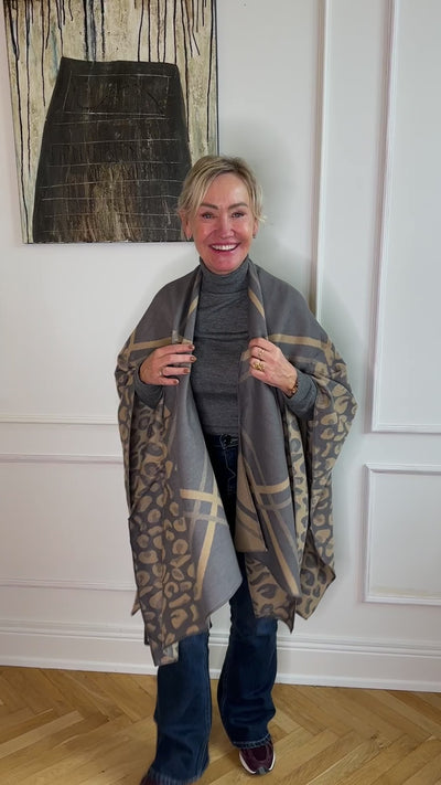 Let og blød poncho i blå/grå med sandfarvede grafiske striber og diskret leopardbort langs kanterne. Vævet i en behagelig blanding med 20% uld for åndbarhed og en andel viscose for formstabilitet og et flot fald. One size, nem at kaste over en skjorte eller jakke – perfekt som let lag året rundt.
