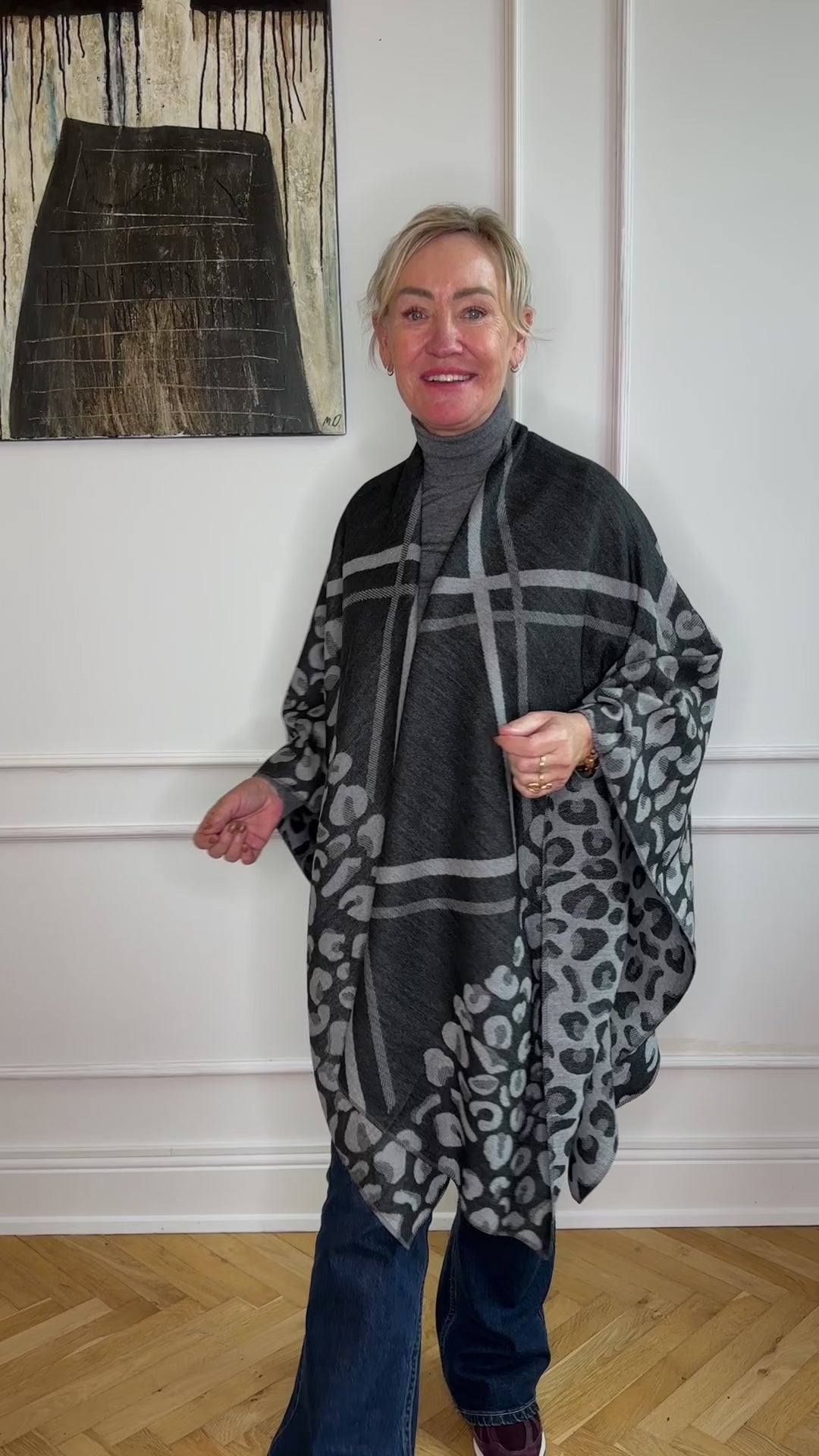 Elegant poncho i sort med grå/sort grafiske striber og leopardkant. Vævet i en blød, let kvalitet med 80% viscose for flot fald og 20% uld for naturlig varme. One size – nem at kaste over en skjorte eller jakke, når du vil have et stilfuldt, varmt lag året rundt.