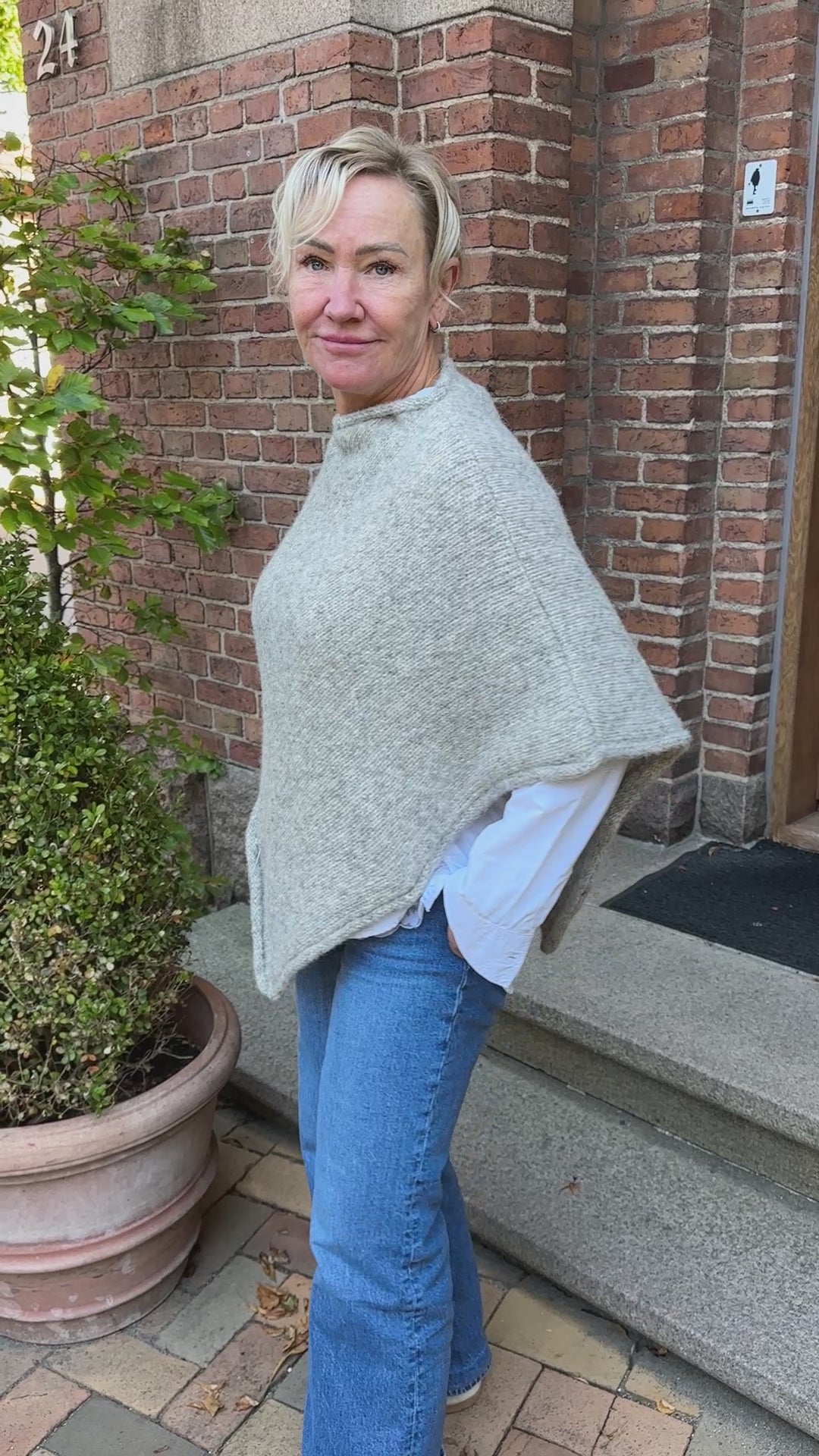 Denne luksuriøse poncho er strikket i en blød og glat kvalitet med rullekant, som giver et elegant og tidløst udtryk. Garnet er en let børstet, meleret blanding, der fremhæver den naturlige struktur og varme glød.