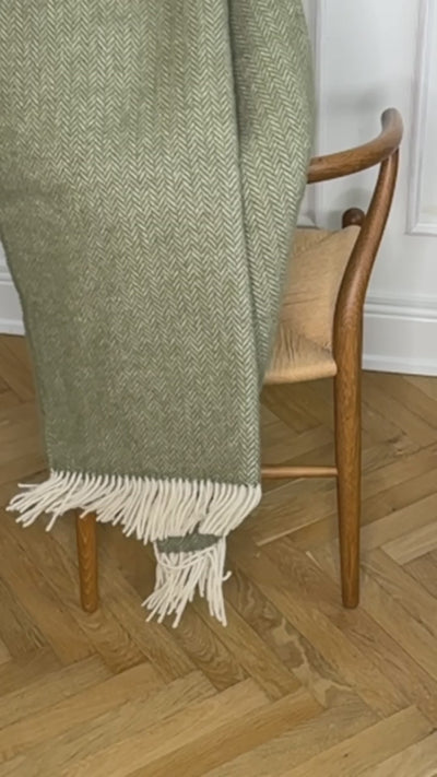 Smuk uldplaid i Tea med sildebensmønster. Vævet i 100% uld for naturlig varme, åndbarhed og lang holdbarhed. De lyse nuancer og offwhite frynser giver et roligt, nordisk udtryk, der passer i både stue og soveværelse. Fremstillet af OEKO-TEX® STANDARD 100 certificeret materiale.