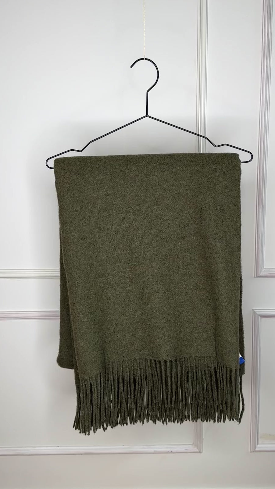 Flot uldplaid med dobbeltsidet farve i mørk khaki. Uldplaiden har designet og fået produceret denne plaid i merinould i Ukraine, en kvalitetsuld, der naturligt tilpasser sig kropstemperaturen og holder behageligt på varmen. Den dybe smukke khaki farve giver en rolig, tidløs accent i stue og soveværelse.