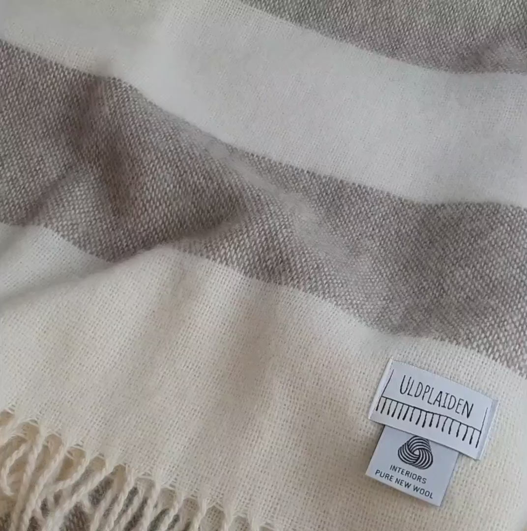Bred randig ullpläd i färgen Taupe från Uldplaiden i mjuk och tätt vävd ull. Tillverkad av 100% italiensk ull. från Sydeuropa som är Woolmark-certifierad och som naturligt reglerar temperaturen och håller dig varm. Den fina taupefärgen med ett lätt uttryck ger en lugn, modern accent i vardagsrummet, sovrummet eller på terrassen.